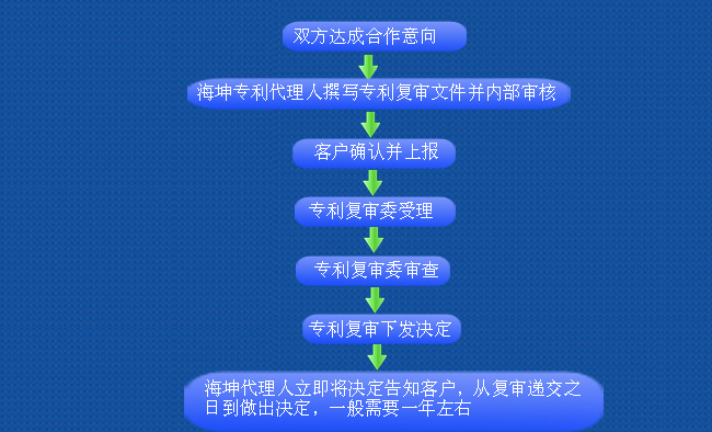 专利申请复审:指专利申请人不服国务院专利行政部门驳回的专利申请的决定,在收到决定之日起三个月内向专利复审委员会提出申请,请求专利复审委员会再次审查申请人提出的专利申请。